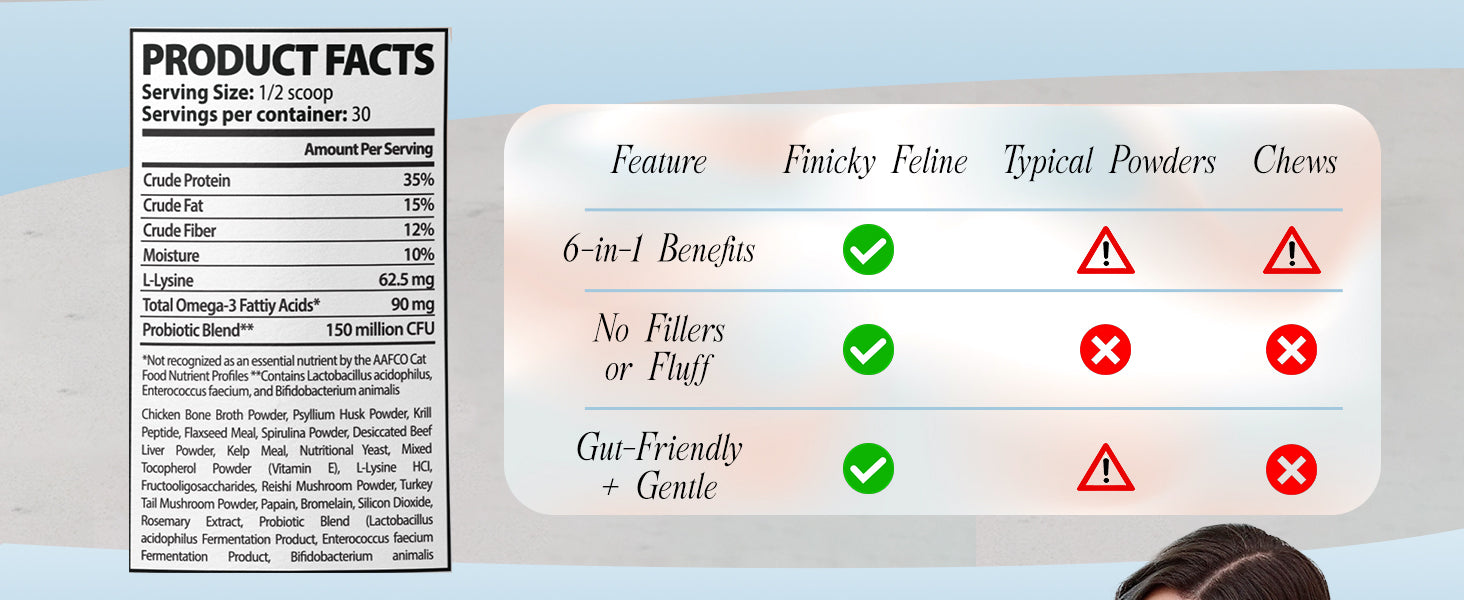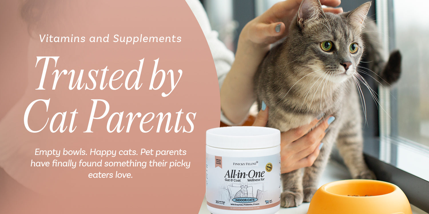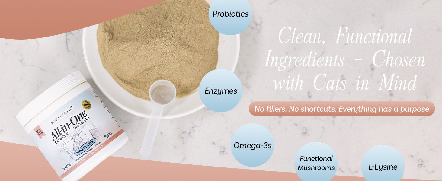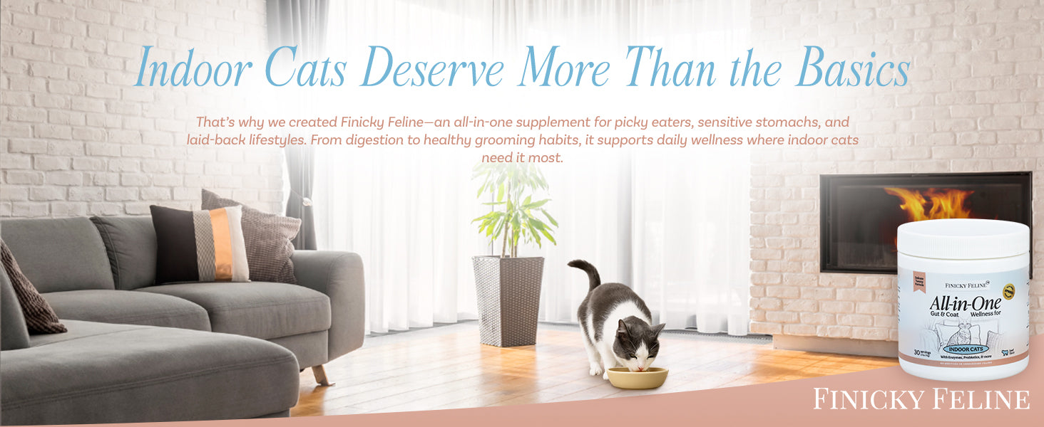 Transform your cat’s daily routine with a single, powerful supplement that covers it all—digestion, coat shine, hairball control, immunity, and oral health. Finicky Feline’s all-in-one food topper is crafted for indoor cats who need extra support but won't settle for less than tasty. It's the perfect solution for busy cat parents looking for convenience without compromise.
